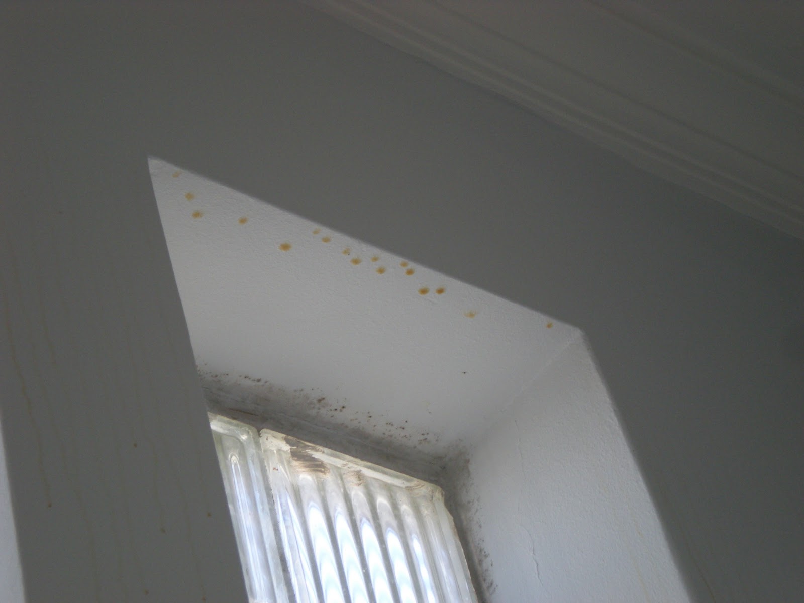 Εδώ στην τρίεδρη γωνία του μπάνιου εμφανίσθηκαν μύκητες αν και η οροφή οι τοίχοι τα δοκάρια και οι κολώνες είναι θερμομονωμένα. Η μικρή όμως θερμογέφυρα που προκαλείται από το στηθαίο που δεν έχει θερμομονωθεί είναι υπεύθυνη για το σύμπτωμα. Στο μπάνιο παράγεται μεγάλη ποσότητα υδρατμών και μάλιστα σε υψηλή θερμοκρασία και οι υγροποιήσεις είναι χεδόν αναπόφευκτες. |