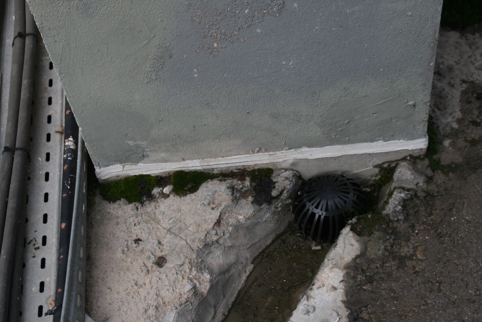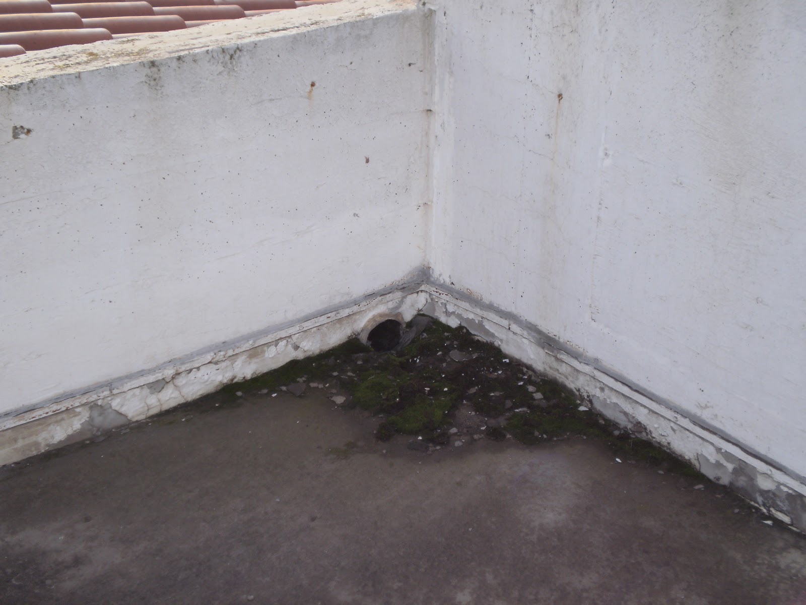 Υδρορροή που εκτονώνει όμβρια που συσσωρεύονται από κακές κλίσεις. Η όλη κατασκευή απαιτεί προσεχτική μελέτη για την ορθή υγρομόνωση του δώματος. Δείτε επίσης τη λάσπη που συσσωρεύεται σταδιακά και θα τη βουλώσει κάποια στιγμή. |